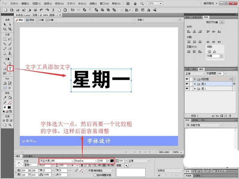 2、使用文字工具添加自己想要设置的文字,然后在属性栏设置文字的字体,大小,字体要选粗一点的,字体也要大一点的字体,如图所示(ps:没有发现属性栏的同学可以在菜单栏》窗口》属性,点击添加设置