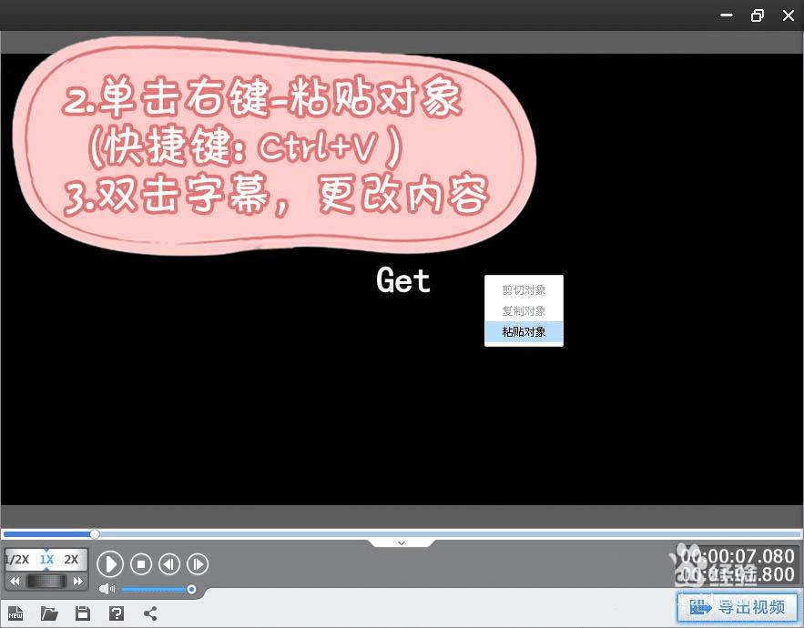 定位到新的时间点,然后单击鼠标右键,在弹出的右键菜单选择“粘贴对象”(快捷键:Ctrl+V),双击字幕,在弹出框输入新的字幕内容,就可以一键复制上一个字幕的所有参数,快速添加字幕。