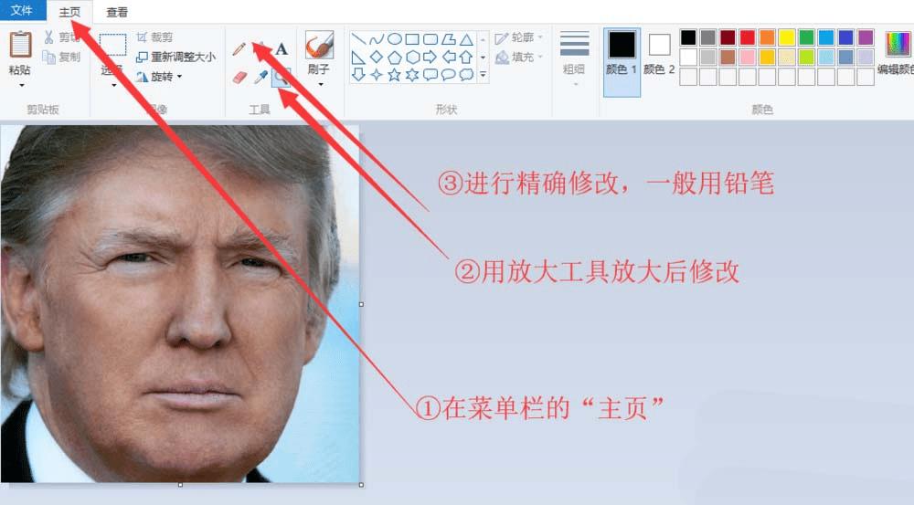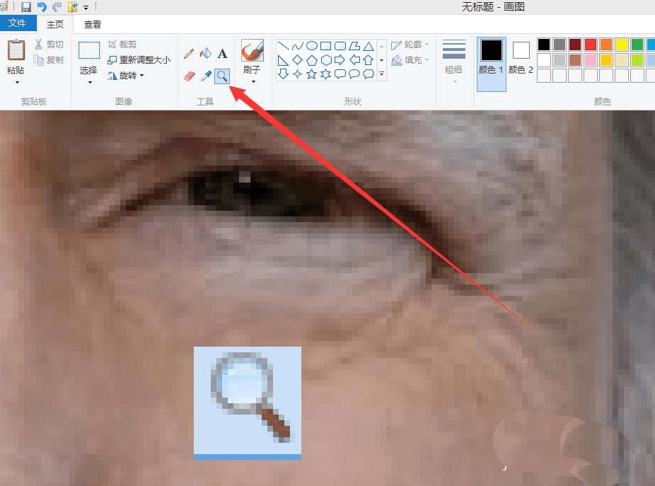2、在画图工具的菜单里,找到“主页”,一般打开画图,就是这个界面。认识一下放大镜和铅笔工具,精确修改离不开这两个工具。