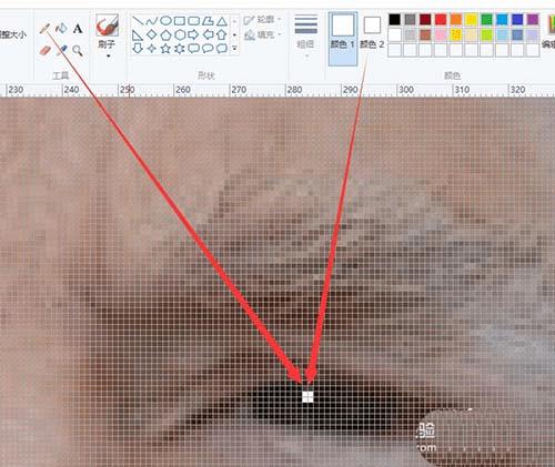 6、如果你对刚才的精度(放大的级别)还不满意,那么请在刚才最后一步的基础上,按一下键盘上的“PrtSc",printscreen这个键是复制整个屏幕的意思。当你再次在画图里粘贴(ctrl+v)的时候,你会发现刚才的4个白色小方格貌似又放大了50倍!如图