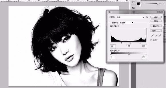 2、随后ctrl+l打开色阶调整面板,调节到如图所示,目的让头发的黑色羽背景白色分明。