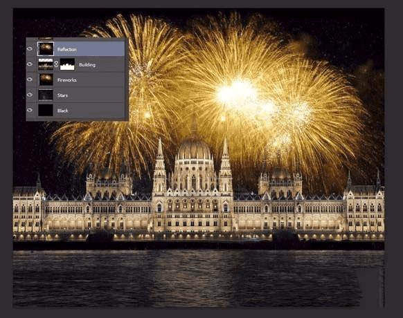8、在图层上单击一次,然后按Ctrl + J进行复制。将烟火图层拖到图层调板的顶部并将其命名为“ 反射”。