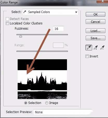 6、为建筑图层添加图层蒙版(图层>图层蒙版>显示全部)。单击图层蒙版并选择“ 选择”>“颜色范围”,然后在天空黑色的某处点击一次。