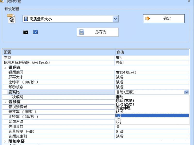 4、在下面的配置中找到宽高比选项,修改数值为4:3,点击确定按钮。
