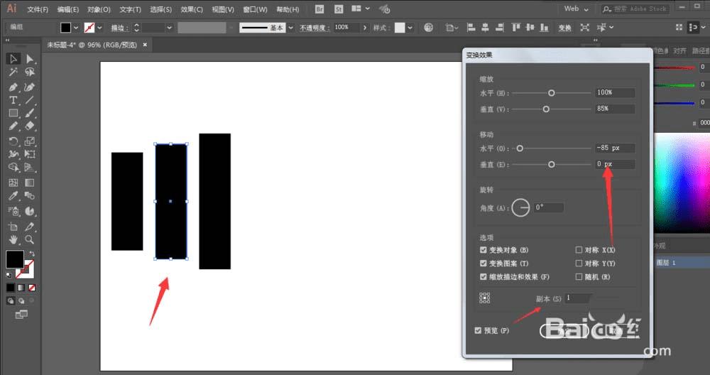 3、点击效果变换效果,调整参数,制作更长一点的长方形,然后同样的方法再操作一次。