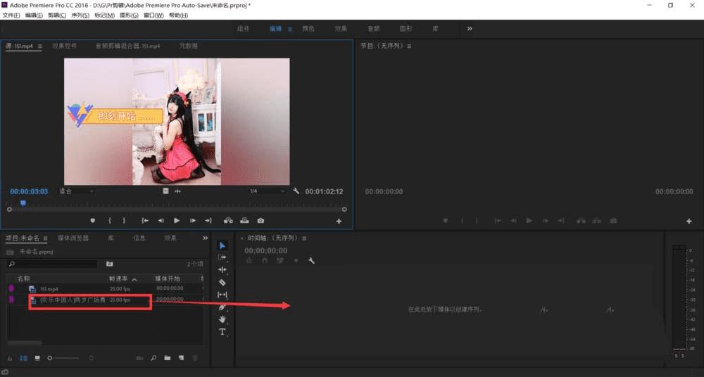 1、首先,进入软件,点击新建项目,完成新项目新建,打开文件素材,将素材拖动到时间轨道新建序列