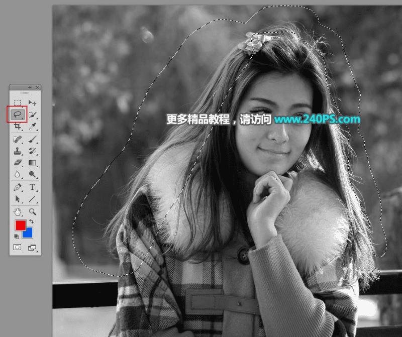 6、在工具箱选择“套索工具”勾出人物主要发丝边缘选区,如下图,并按Shift + F6 羽化5个像素。