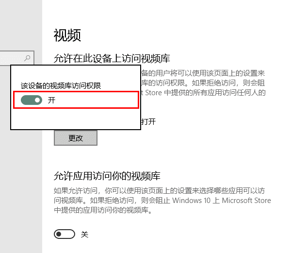6、视频库访问权限的开关打开以后,再将“允许应用访问你的视频库”的开关打开。