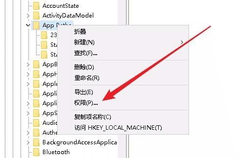 4、右键点击“App Paths”注册表项,在弹出的右键菜单中选择“权限”菜单项。
