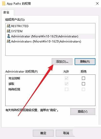 5、这时就会打开该注册表项的权限设置窗口,看 一下用户列表中是否有当前的用户,如果没有的话,点击“添加”按钮
