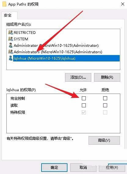 7、接下来在打开的用户名列表中选择当前的用户,然后在下面的权限中勾选 “完全控制”复选框,最后点击确定按钮就可以了。