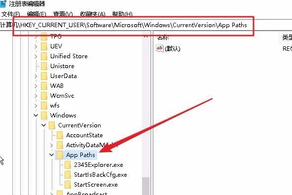 3、在打开的注册表编辑器窗口中,定位到HKEY_CURRENT_USER\Software\Microsoft\Windows\CurrentVersion\App Paths注册表项。