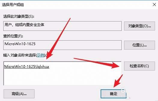 6、接着就会弹出“选择用户或组”的窗口,在文本框中输入当前的用户名,然后点击检查名称按钮,最后点击确定按钮即可