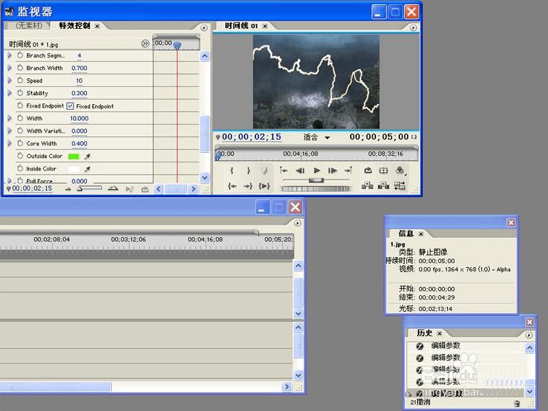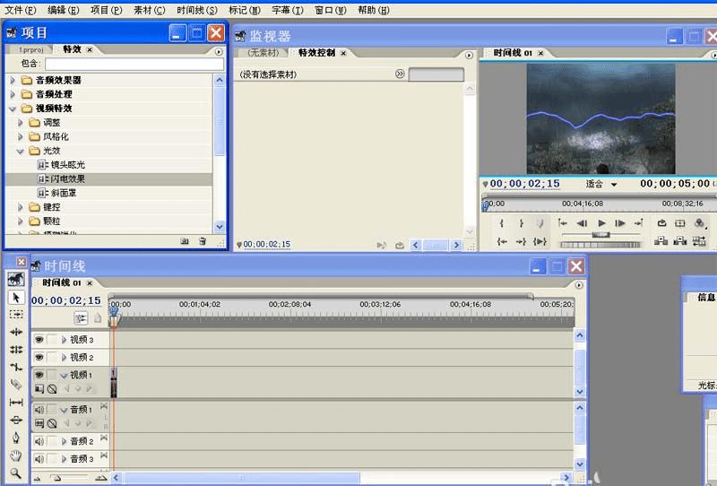 2、执行特效-视频特效-闪电效果命令,将该效果拖拽到视频轨道1上。