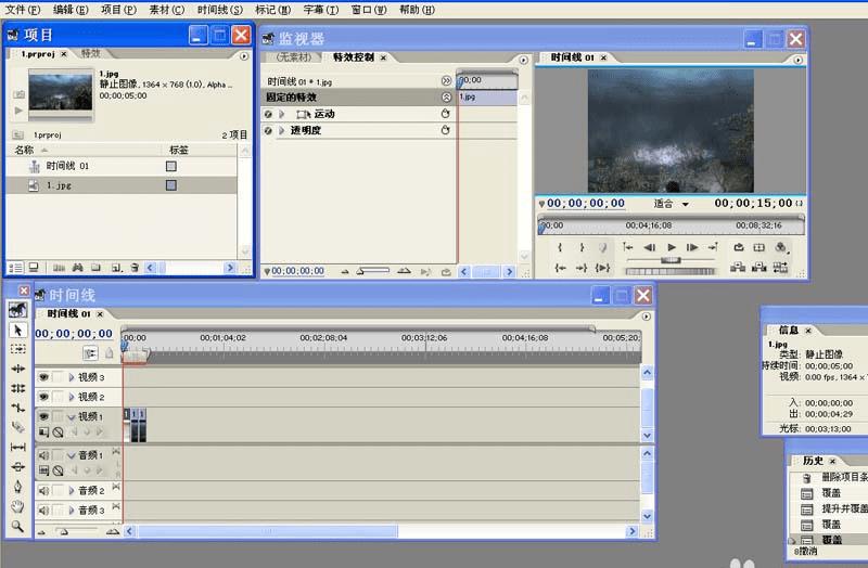 1、首先启动premiere7,新建一工程,在项目库中导入一张素材图片,将该素材拖拽到视频1轨道上。