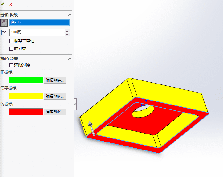 2、分析拔模:点选模具工具中的拔模分析,分析参数中第一栏选择底面(图中的红框),通过点击灰色箭头可以改变拔模方向。可以看出模型上有红、黄、绿三种颜色。拔模分析得到了红绿黄三色,红色为负拔模,将来与型芯接触;绿色为正拔模,将来与型腔接触;黄色则是需要添加拔模的面。我们希望外表面与型腔接触而内表面与型芯接触,所以需要添加拔模使外表面变为绿色而内表面变成红色。