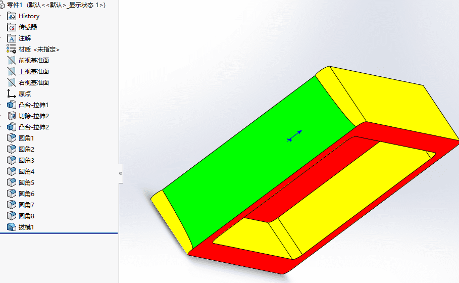 3、拔模:以其中一个面为例。先点击工具“拔模”,拔模角度设置为和拔模分析相同的数值。拔模方向选择方法图中红框面,并点击灰色箭头使方向与拔模分析时用的方向一致。然后再选择一条分型线。然后点√,然后可以看到该面已经变成绿色。然后用同样的方法将所有黄色的面都变成绿色或者红色。注意内表面的拔模方向与外表面相反,完全添加拔模后模型只有红色和绿色。