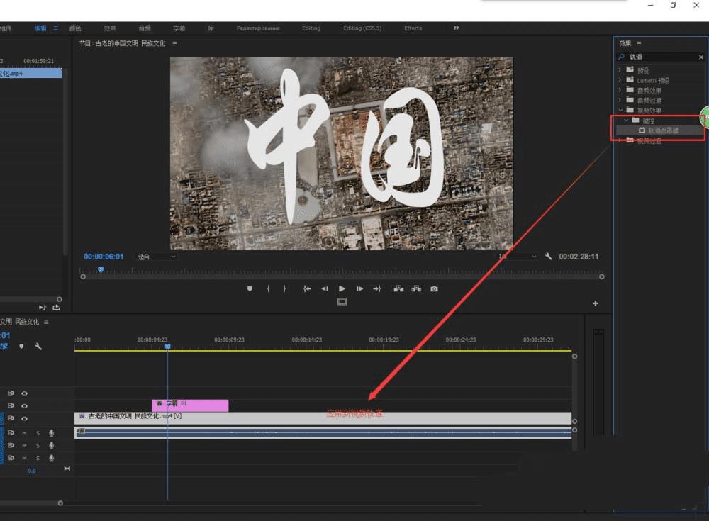 7、打开效果窗口,搜索关键字“轨道遮罩键”,会在效果窗口中找到并显示该效果,将该效果拖到应用于视频文件上。