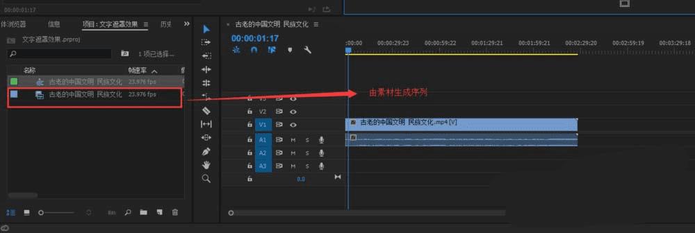 3、选中在上一步中导入的视频素材,按住鼠标左键不松拖入到下方中间的时间轴面板中,然后单击鼠标左键,由视频素材来产生一个序列。