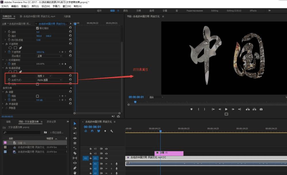 8、添加完效果之后,打开效果控件窗口,找到轨道遮罩键效果设置,遮罩选择“视频2”,合成方式选择“Alpha遮罩”,然后我们就看到一个文字遮罩效果就已经出现了。