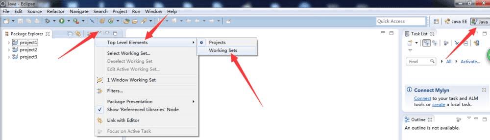 3、点击倒三角后,下拉菜单中点击Top Level Elements--->Working Sets,