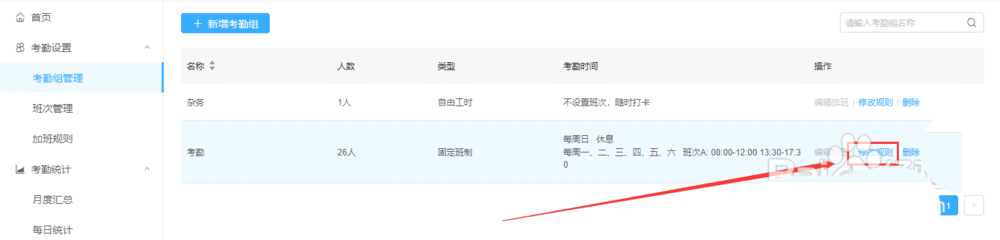 5、在考勤组管理里面找到想要修改的考勤组,再点击后面的修改规则。