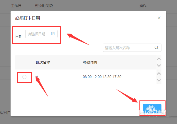 7、在上面选择必须要打卡的日期,中间选择必须要打卡的考勤组,最后点击确定