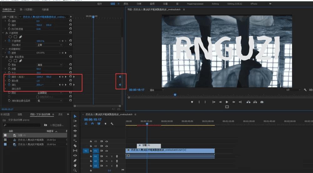 7、选中时间轴中文字字幕,打开效果控件窗口,在紊乱置换效果中调整好数量大小,然后在偏移(湍流)和演化分别打上一个关键帧,并调整偏移(湍流)的数值。