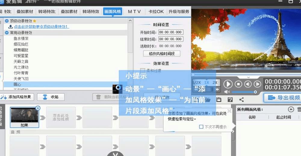 3、接着点击菜单栏的“画面风格”-“动景”-“画心”-“添加风格效果”-“为当前片段添加风格”。