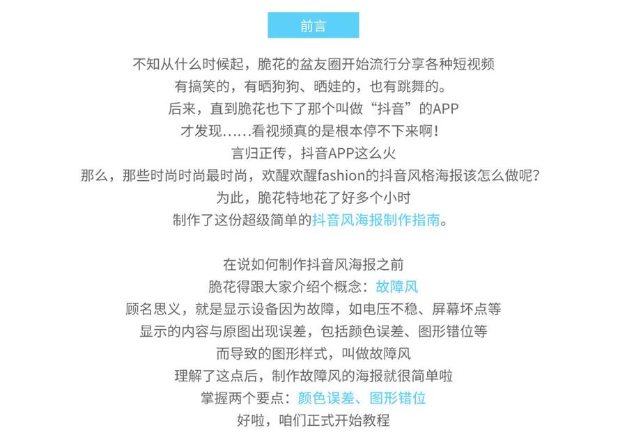 故障艺术是什么?抖音故障风格海报怎么做?所谓“故障艺术”,就是利用事物形成的故障,进行艺术加工,使这种故障缺陷反而成为一种艺术品,具有特殊的美感。这样的设计风格并不是即兴发挥而成的,它来自电子设备成像技术里的出人意料的图像错误。这种错误的图形,由于具有独特的风格魅力。开始被艺术家所接受,经过美化与处理之后,就形成了现在的数码故障艺术。而且现在非常流行的抖音风格也是用这种特性,推荐给路饭的朋友学习,希望大家可以喜欢。