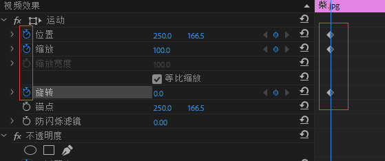 看到‘’效果控件‘点击红框中的图标,图标变蓝,出现如右边所示的那个小菱形,这代表已经添加此时的对应效果的关键帧了,再点击一下,则删除对应关键帧,如图三,点击圆形图标,添加关键帧