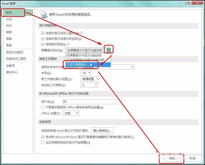3、隐藏屏幕提示说明文字。打开“Excel选项”对话框,单击“常规”选项卡,单击“屏幕提示样式”右侧的下三角按钮,在展开的列表中单击“不显示屏幕提示”,完成后单击“确定”按钮,如下图所示。