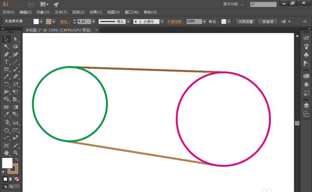 6、点击描边为绿色的圆上方,然后在描边色为粉红色的圆上方点击,2个圆的相切线就画出来了,如图: