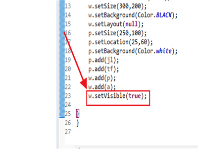 6、第六然后就到窗口显示最重要的时刻。输入代码为a.setVisible(ture);。其中的ture就是使窗口可视化。就是现在运行代码的话,窗口就可以看见了。