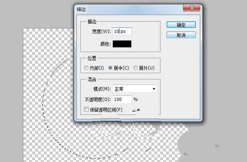2、选择椭圆选框工具,按住shift绘制一正圆,执行编辑-描边命令,设置宽度为10像素,颜色为黑色。