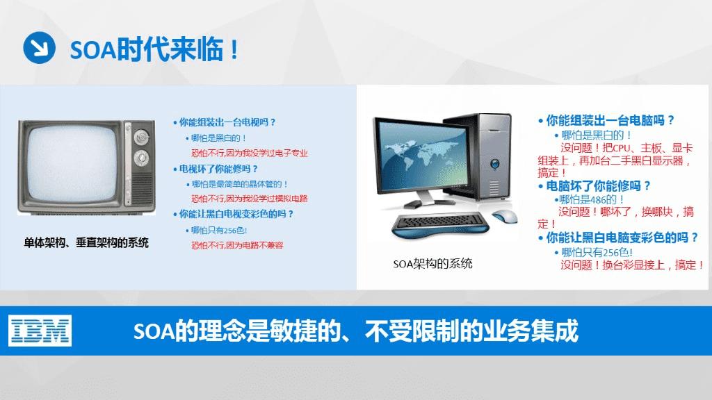 从现在来看,SOA,虽然并没有像各大厂商的鼓吹的那样无所不能。但是在一定的时期的确是推动了信息化的进步。个人认为,SOA的理念——“敏捷的、不受限制的业务集成”直到如今,依然适用!