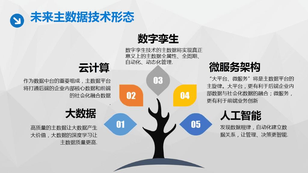 技术推动了时代的变迁,未来主数据一定是融合了大数据技术、云计算技术、数据孪生技术、微服务技术的、人工智能技术的应用平台,主数据离不开技术却超越技术。备注:在之前的分享里有提到主数据的3大特点、4大超越有相关说明,有兴趣可以看下。可在微信公众号中搜索《主数据的3大特征、4项超越和3个二八原则》