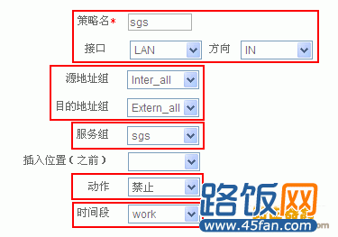 3、在完成服务组的配置后,进入到 WebUI—防火墙—访问控制策略 页面,将地址组、服务组等信息引入,并将动作设为禁止,如图3所示。
