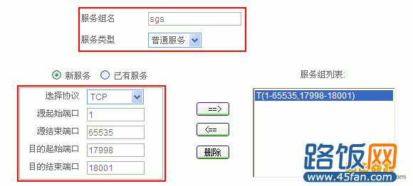 2、《三国杀》游戏进入方式有两种:网页版和软件版。通过抓包分析,可以通过做防火墙策略将游戏所用到的几个固定端口(TCP协议,目标端口17998到18001)关闭,以实现屏蔽《三国杀》游戏。首先配置服务组,将《三国杀》游戏用到的几个固定端口设定,在 WebUI—防火墙—服务组 页面,如图2所示。