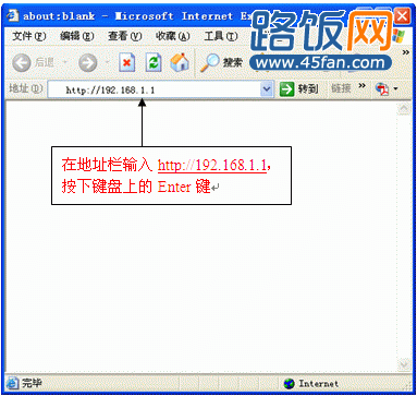 2. 点击IE浏览器,在地址栏中输入http://192.168.1.1,点击Enter。如下图所示: