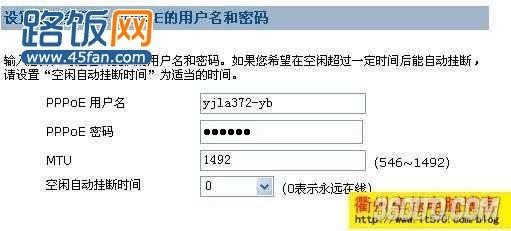 4、在PPPOE的用户名和密码选择中输入由运营商提供的用户名和密码,空闲自动挂断时间设置为零,表示永远在线。点击下一步,