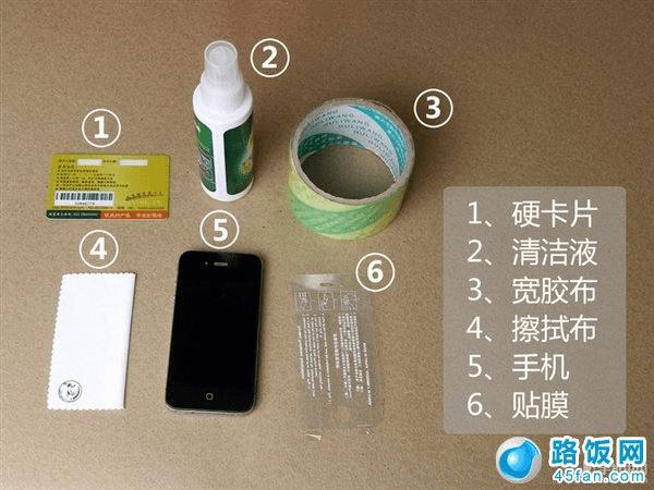 俗话说得好:“工欲善其事,必先利其器。”在开工之前,我们首先要准备好一些工具,贴膜、清洁布、清洁液是必不可少的。至于硬卡片和宽胶布的作用,稍后会跟大家介绍,在这里先卖个关子。