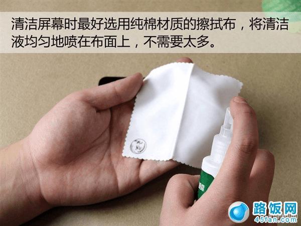 擦屏幕是准备工作中的重要环节,清洁液并不需要喷太多,多了反而会影响擦拭屏幕的效率,有时还会因为屏幕上过于湿润而沾染灰尘。
