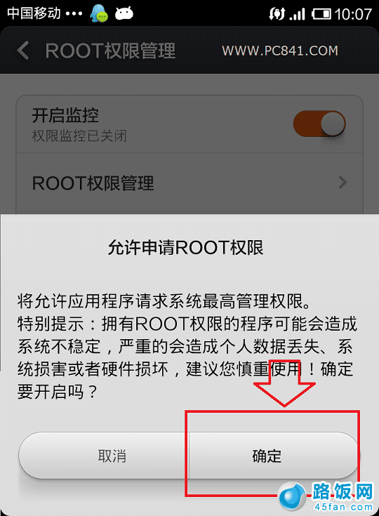 4、如上图,进入授权管理里边的界面之后,我们再进入“ROOT权限管理”,然后里边会看到有“开启监控”设置,我们需要把“开启监控”开关给打开,打开的时候会提示“允许申请ROOT权限”提示,我们点确定即可,如下图: