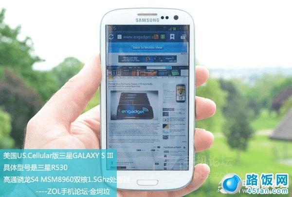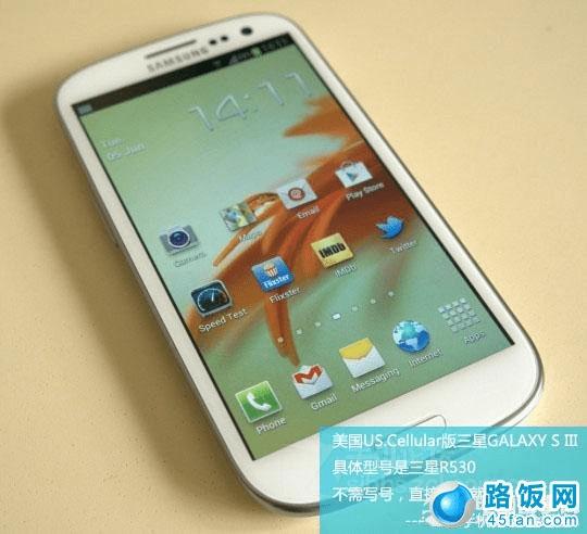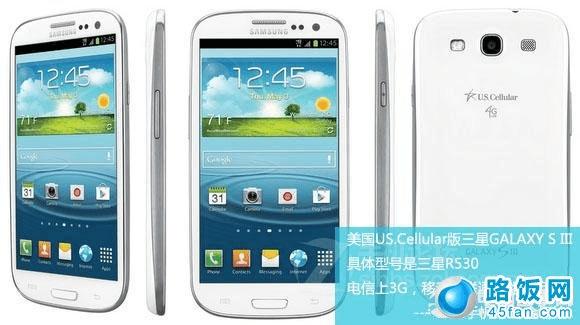 2、US.Cellular版 GALAXY S III 具体型号R530(电信,只有水货)美国US.Cellular GALAXY S III R530(电信插卡直接使用)通话、短信、3G等非常稳定US.Cellular电信公司定制的R530手机配置为双核1.5Ghz处理器,运行内存RAM-2GB,内置存储空间分16GB和32GB二个版本,原生卡座,直接插卡就可以使用