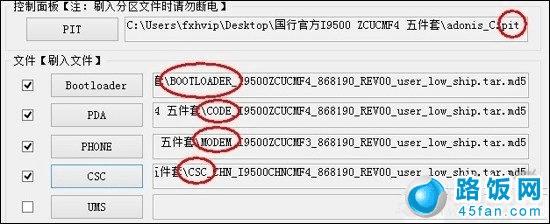 4、将下载的救砖五件套压缩包解压,里面包含五个文件,依次在ODIN里选择,pit处选择后缀为“pit”的分区文件、Bootloader选择带有“bootloader”字样的文件、PDA处选择带有“PDA或CODE”字样的文件、PHONE处选择带有“PHONE或者modem”字样的文件、CSC处选择带有“CSC”字样的文件。在选择pit文件之后重新分区的勾会自动勾选,请勿取消。全部按照默认标准。然后点击开始刷机即可,等待5-10分钟手机刷机完成后会自动重启。