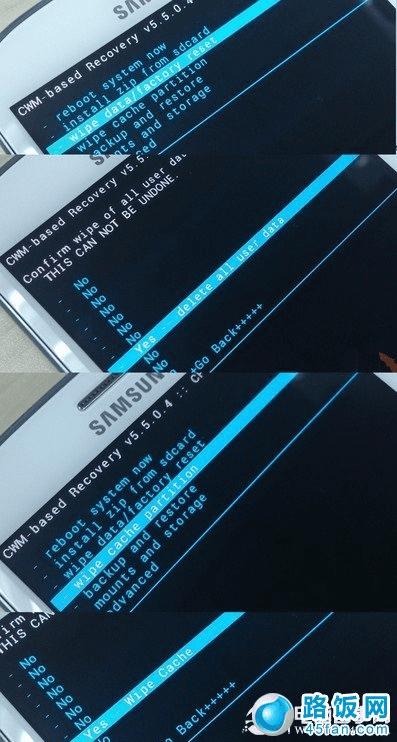 也可以通过按键方式进入恢复模式,方法:关机状态下,同时按住音量上键+HOME+电源键。依次执行(音量键选择,电源键确认):