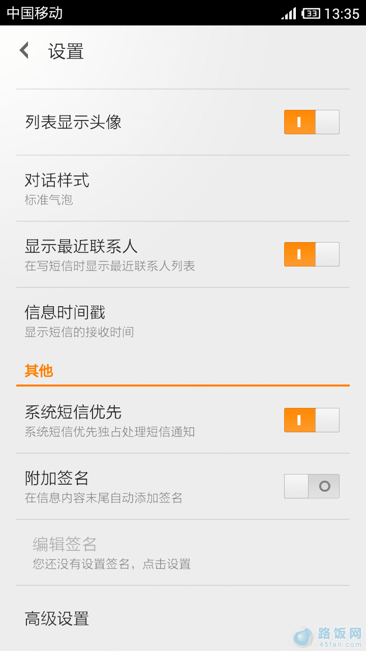手机WAP推送信息烦人?简单几步就能关闭 来源:www.45fan.com 2014-10-13 08:43:31 智能手机应用很多,好用好玩的同时也会常收到WAP推送信息,一天多的时候能有好几条,而且信息内容也基本没什么价值。今天小编就分享下如何关闭这功能。 1、进入短信后点菜单键,如下图,再点设置 2、进入设置选项后再点里面的高级设置 3、进入高级设置应该看到点啥了吧,呵呵,把允许WAP推送关闭了。 看完是不是觉得非常简单,那就赶紧试试关闭那讨厌的推送信息吧。 推荐阅读