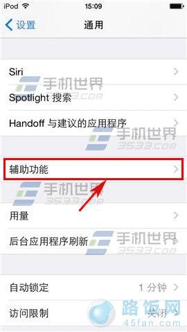 设置iPhone6Plus黑白屏幕要怎么操作? 来源:www.45fan.com 2015-02-19 15:26:16 现在都用智能手机,是否怀念以前的黑白屏幕呢?下面小编就教大家iPhone6Plus黑白屏幕的设置方法,偶尔怀旧一下很不错哦! 1)进入iPhone6Plus的【设置】,然后选择【通用】选项。 2)点击【辅助功能】,然后把【灰度】选项打开即可。 推荐阅读