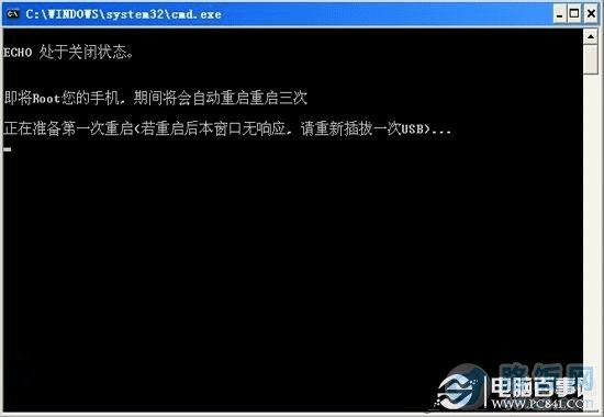 3、 手机重启完成之后在设置-应用程序中分别将“未知源”与开发选项中的“USB调试模式”打上勾,然后用数据线将手机连接至电脑,运行 defy+_toolsOneClickRoot+Recovery目录中的ROOT.cmd开始获取ROOT权限和安装第三方Recovery。过程中 手机中手机会重启三次,完成之后弹出的cmd窗口会自行关闭。